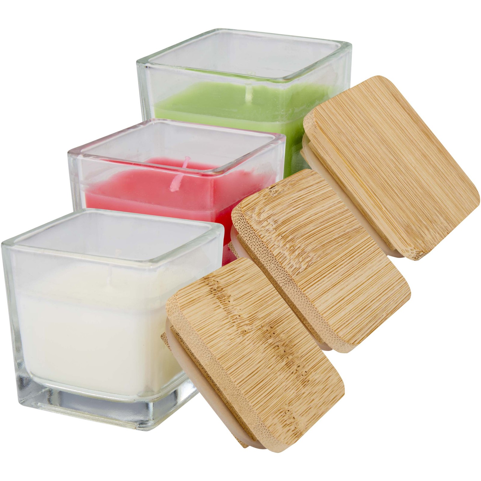 Bringen Sie mit dieser Duftkerze aus Paraffin stilvolle Atmosphäre in Ihre Räume – edel verpackt in einem quadratischen Glasgefäß mit Bambusdeckel. Erhältlich in drei einladenden Duftvarianten – Crisp Apple (grün), Sweet Cherry (rot) und Warm Vanilla (weiß) – sorgt jede Kerze für ein behagliches, willkommenes Raumgefühl. Perfekt zum Entspannen zu Hause oder als liebevolles Präsent. Gewicht der Kerze: 40 g. Brenndauer: 8 bis 12 Stunden.