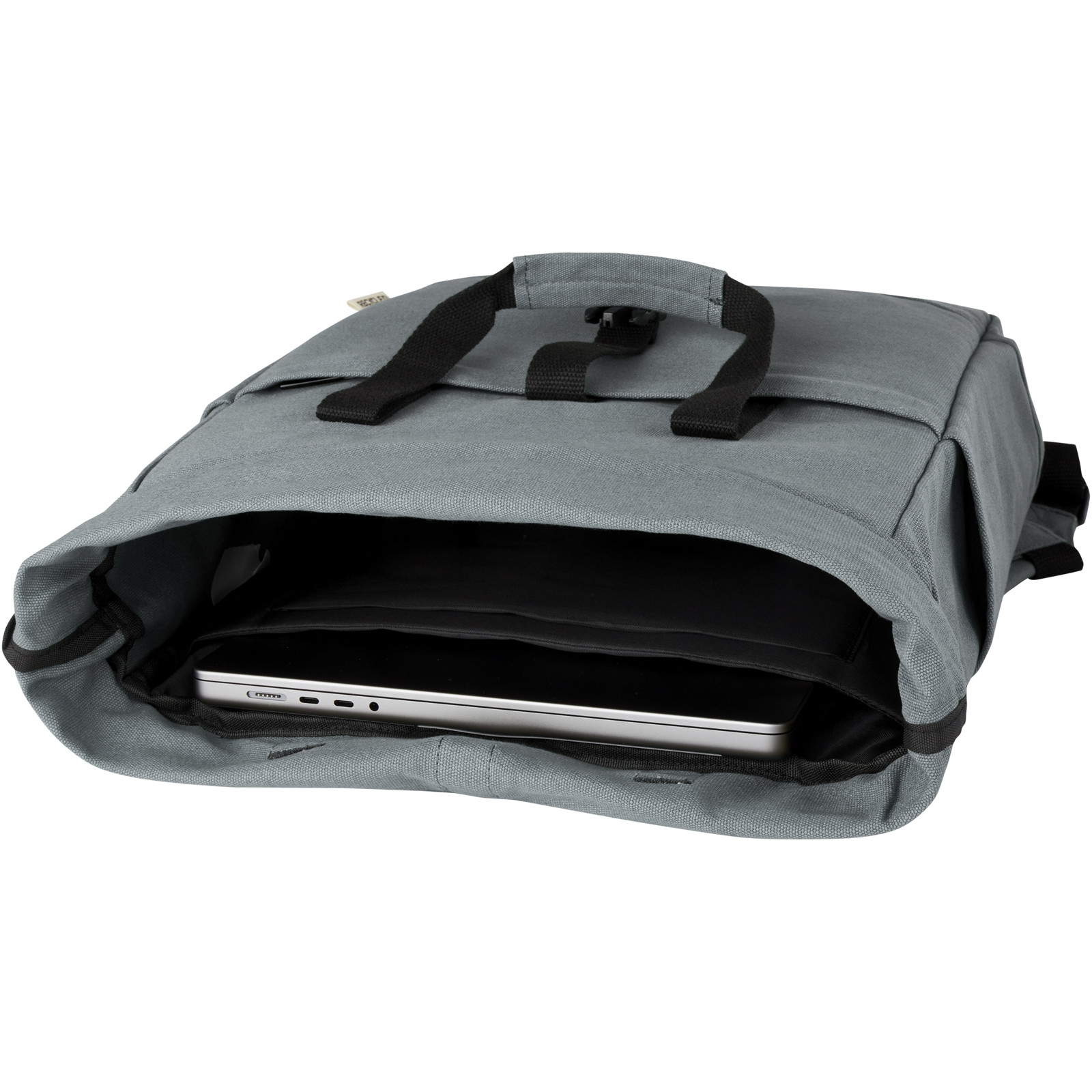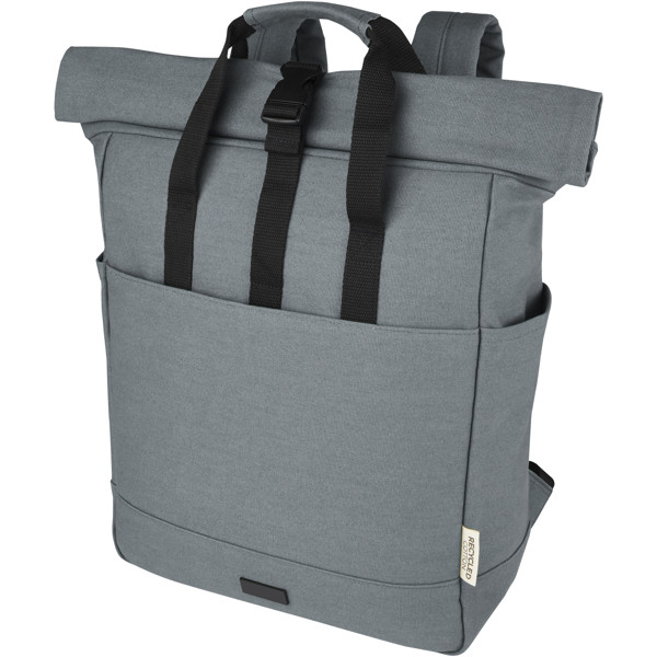 Der vom Einzelhandel inspirierte Rolltop-Rucksack Joey besteht aus GRS-recyceltem Canvas und GRS RPET-Futter, und verfügt über ein spezielles Tabletfach sowie ein gepolstertes 15"-Laptopfach. Der Rucksack hat außerdem 2 seitliche Taschen für Wasserflaschen und eine große Fronttasche mit Reißverschluss sowie eine Rolltop-Öffnung mit Reißverschluss für maximale Kapazität und Sicherheit. Die 2 verstärkten Tragegriffe aus Gurtband machen es einfach und bequem, die Tasche als Business-Tasche zu tragen. Die dekorative Metallplatte kann ein Logo durch ihre dezente und matte Oberfläche zum Leuchten bringen.